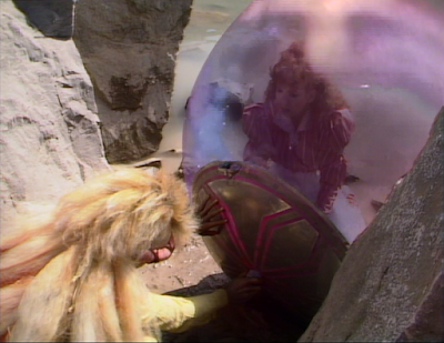On the whole, it has to be admitted that Time And The Rani is not one of these better moments, and the ridiculous ear-assaulting quantity of screaming and yelping gets so much that Ikona actually asks her to 'stop squawking'. In fairness, the script does call for her to match a ludicrously hammy Kate O'Mara's impersonation of her characteristic for characteristic, and she may also have been unconsciously if ill-advisedly over-compensating for her new co-star's nervousness, and for Ikona's general inertness. In equal fairness, there are some scenes in which she gives a decent performance, notably the one in which Faroon learns about Sarn stepping on the spinny globe thing; a scene which it's worth noting also features an impressively and suitably restrained contribution from Keff McCulloch. Overall, however, the exaggerated stagey running and alarmingly expansive smile don't quite sit easily with the show's much-vaunted new direction, and as unfair as it is to do too much finger-pointing in one direction, those shrieky interludes have probably played a large part in securing the reputation that Time And The Rani currently 'enjoys'.