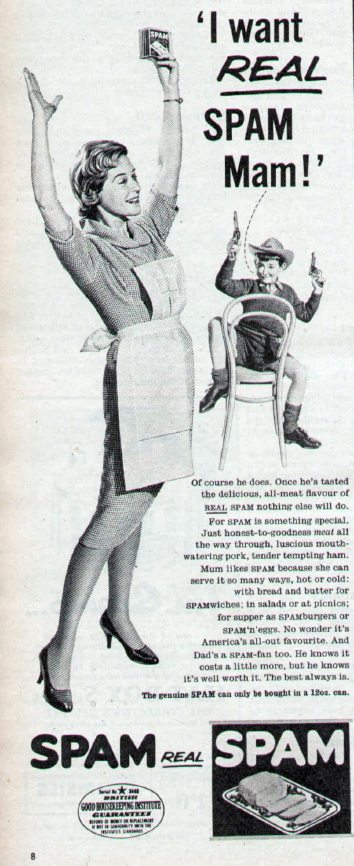 Meanwhile, the ones that mother gave you didn't do anything at all, which is presumably why this inexplicably Wild West-fixated youngster is demanding real Spam from his mam, as opposed to all that fake Spam they're always trying to palm off on us. In fact it goes as far as to confirm that genuine Spam can only be bought in a 12oz can, so keep an eye out for those crafty imitators. Meanwhile, quite why his mother is standing in the exact same pose as a Subbuteo goalkeeper is not specified.